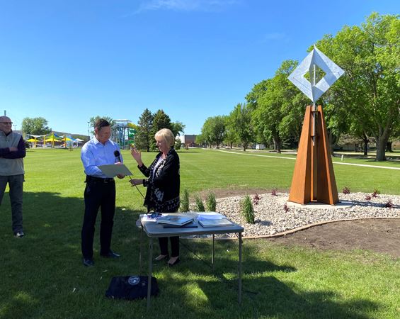 The sculpture in the Te Paskes’ name was dedicated Friday in Open Space Park. Mayor David Krahling expressed deep appreciation for the Te Paskes’s impact, saying that shared facilities used by the City, schools, and Dordt University are one of his greatest gifts.